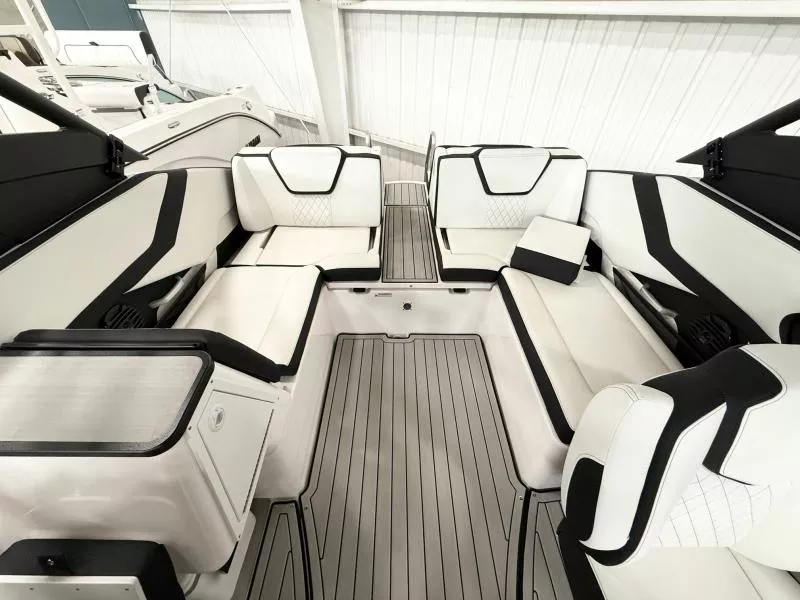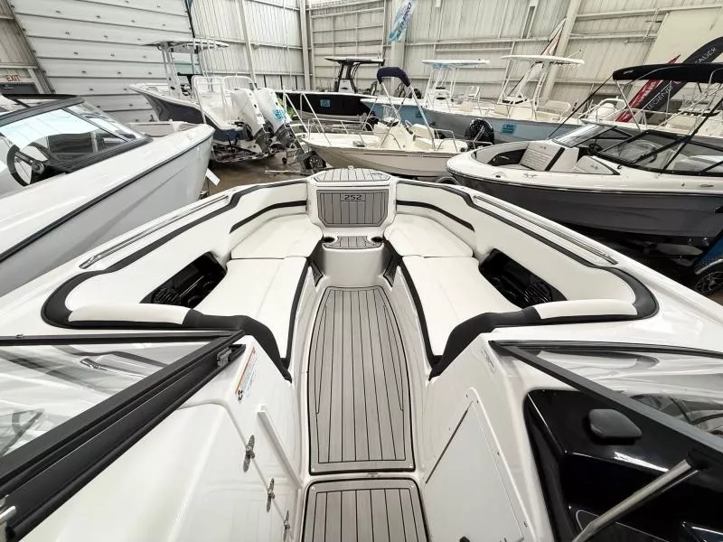 The 252 SD is powered by twin 1.9L High Output Yamaha engines, delivering smooth acceleration and exceptional performance in a 25-foot package. With seating for up to 12, a roomy bow with backrest cushions, and a spacious cockpit, it's built for comfort and group enjoyment. The oversized in-floor storage locker easily handles wakeboards and gear, while the 5" Connext touchscreen at the helm simplifies control of boat systems and entertainment. A custom-painted trailer ensures this jet boat turns heads on land and water alike.