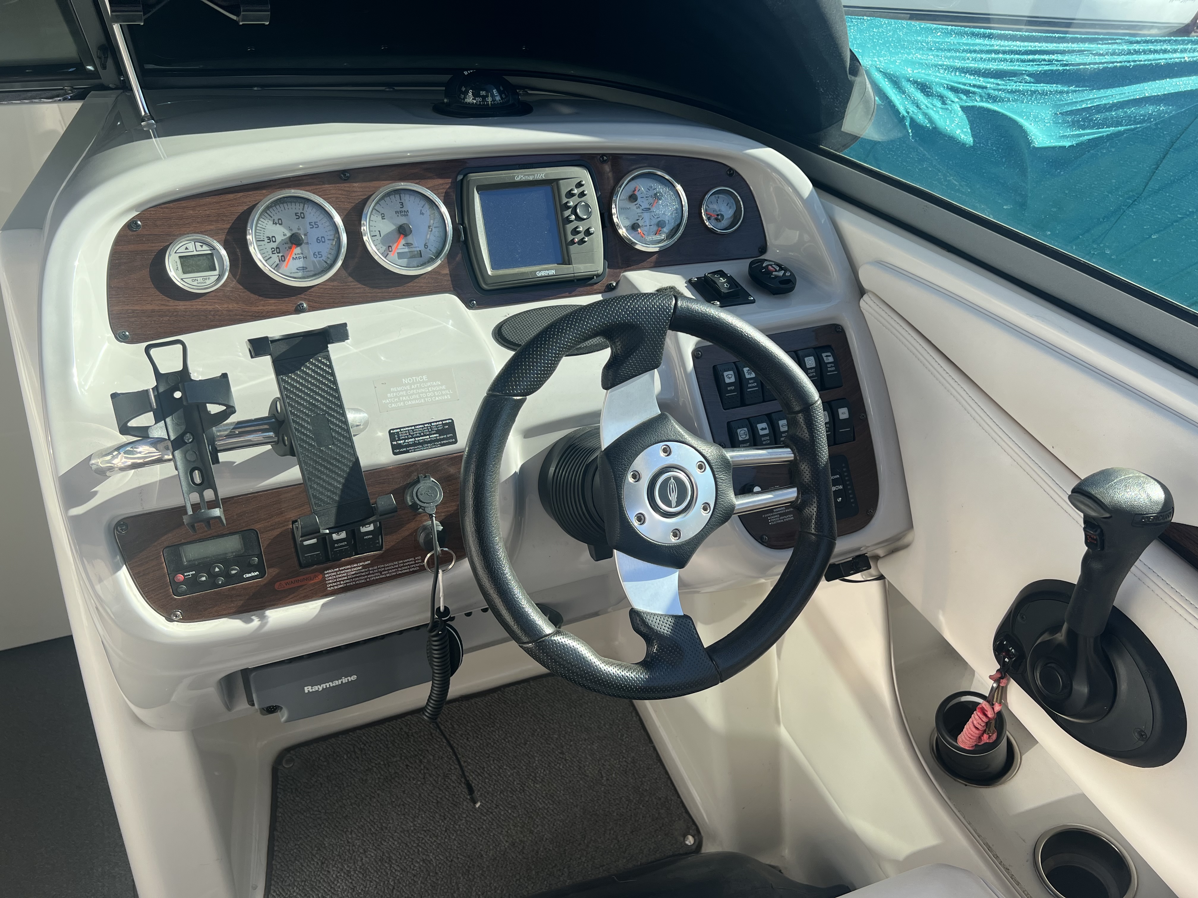 Additional Factory Options: Wide Band Gel-Coat, Convenience Package, Premium Package, Vacuflush Head, Bow Filler Cushions, Bow Table, Snap In Carpet, Cockpit Refrigerator, Transom Shower, Raymarine VHF Radio, Trim Tab Indicator, Lights, Galvanized Anchor, Quick and Quiet Thru-Hull Exhaust, Radar Arch, Air Pump, Cockpit and Bow Covers, High Ski Tow, Full Canvas Enclosure, Windlass, Shore Power, On Board Gas Grill