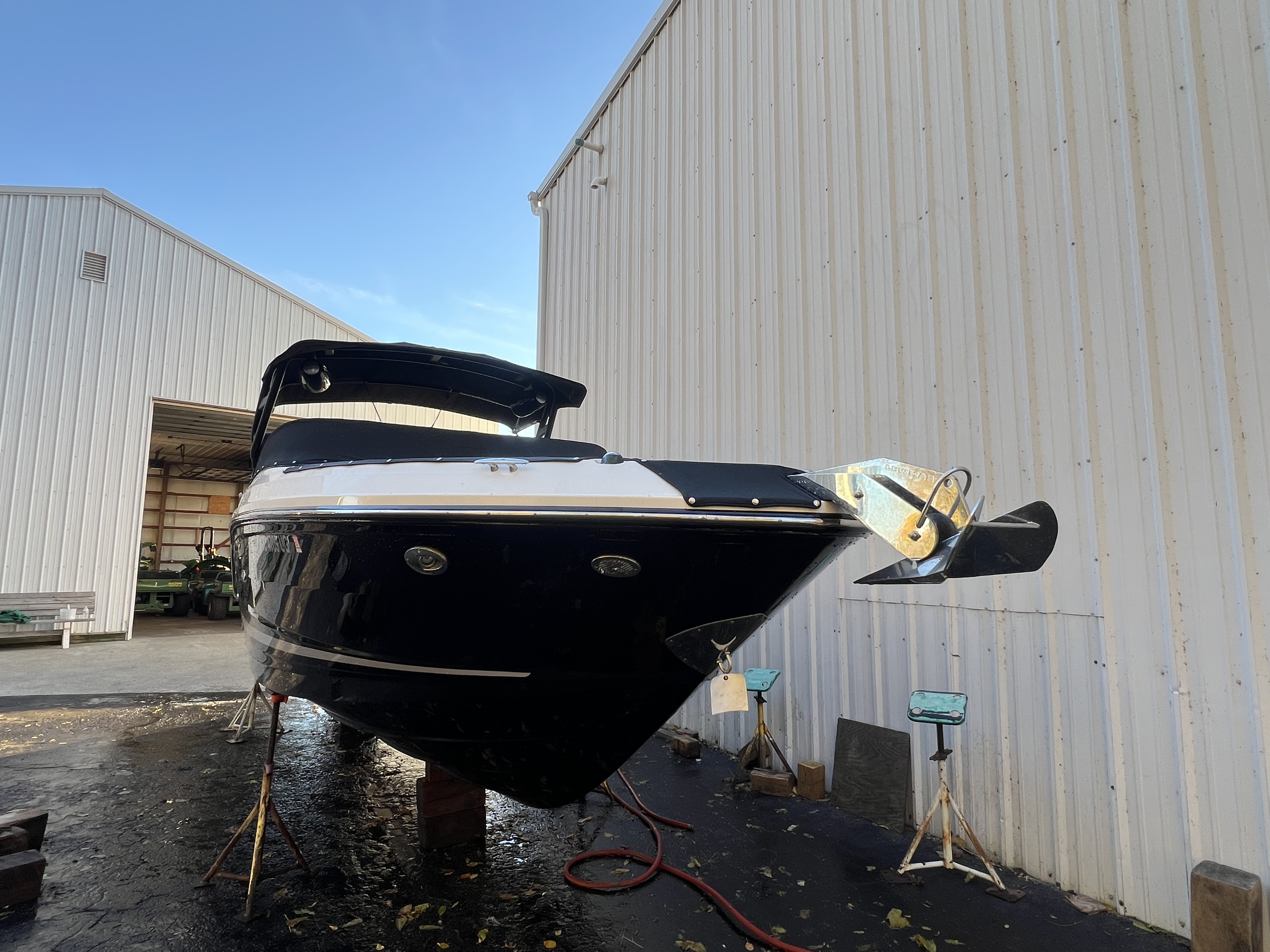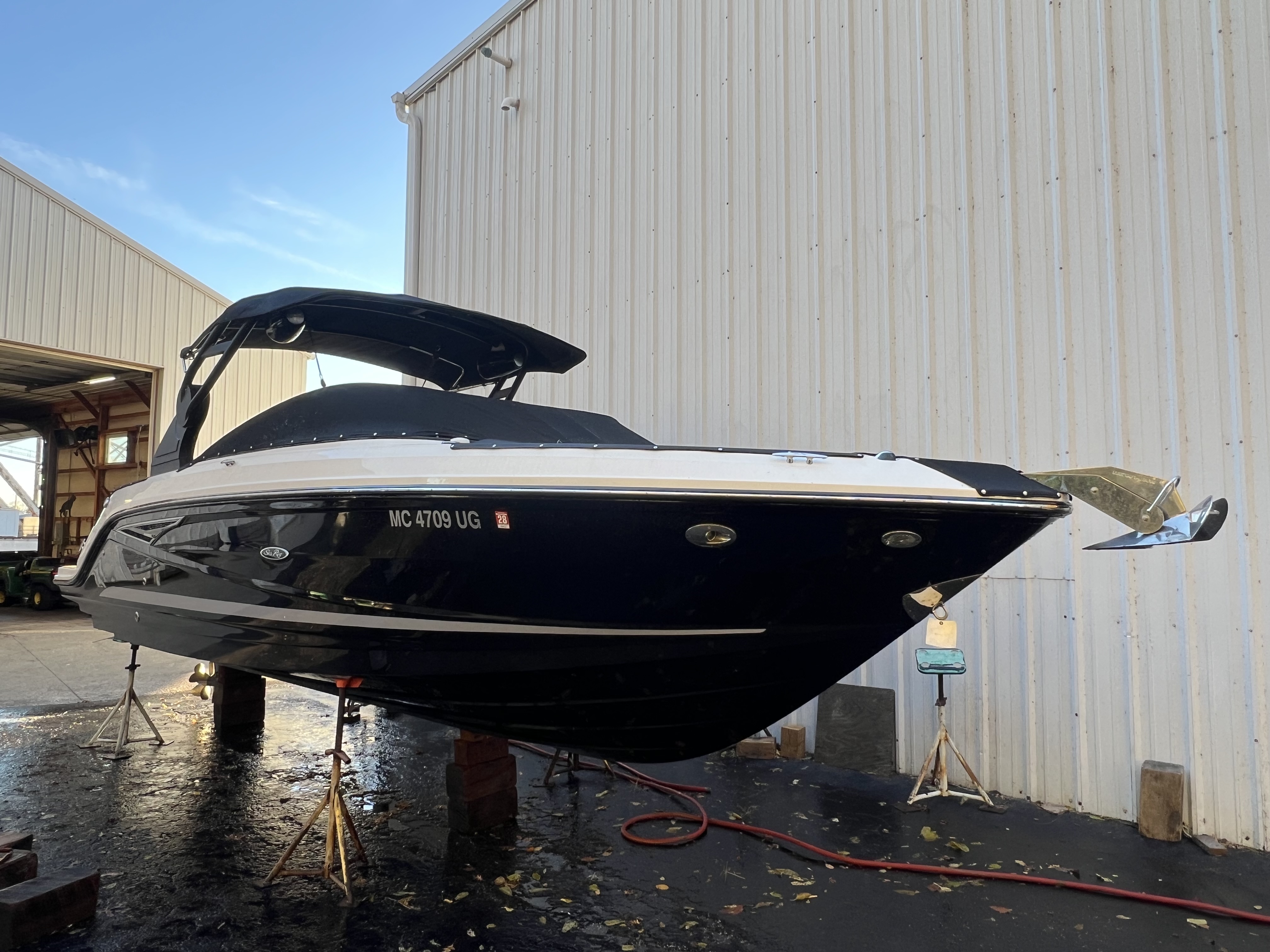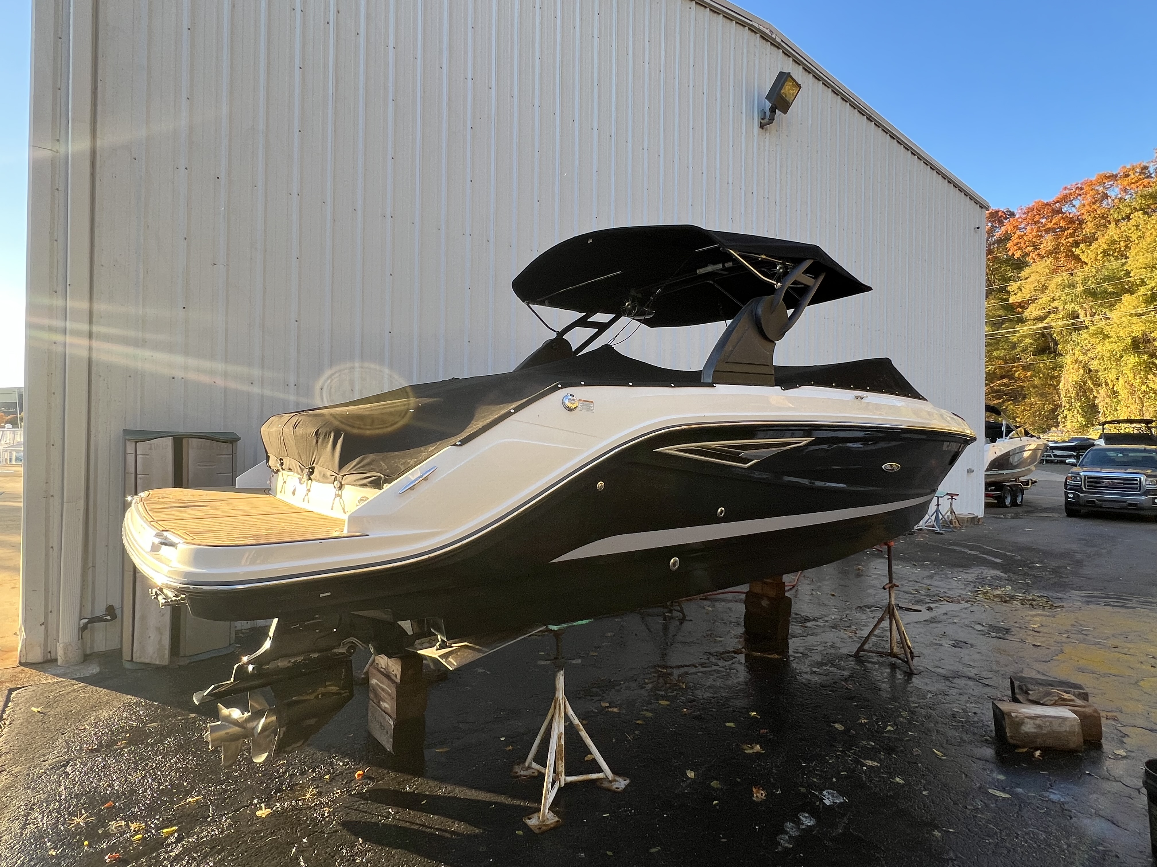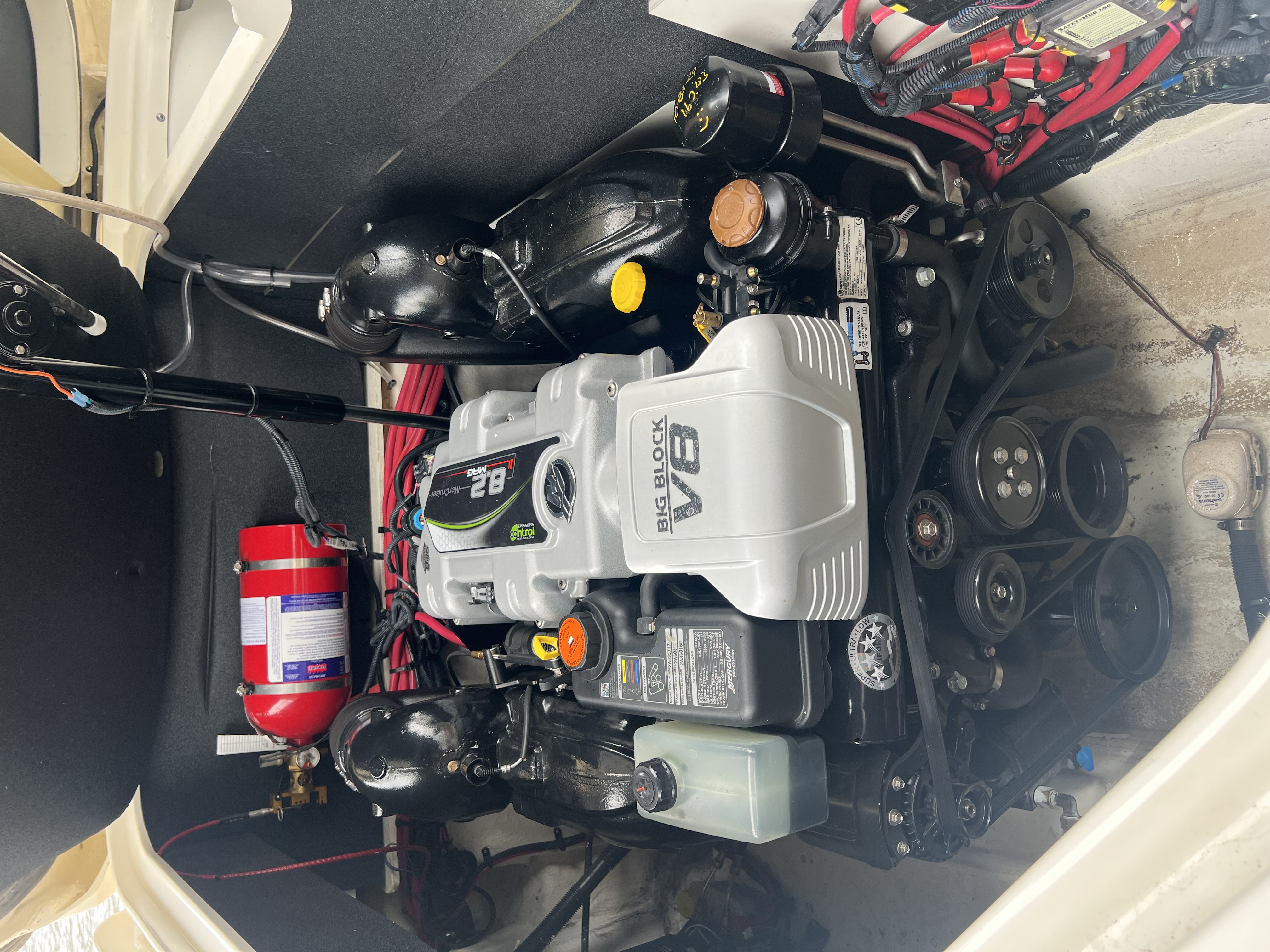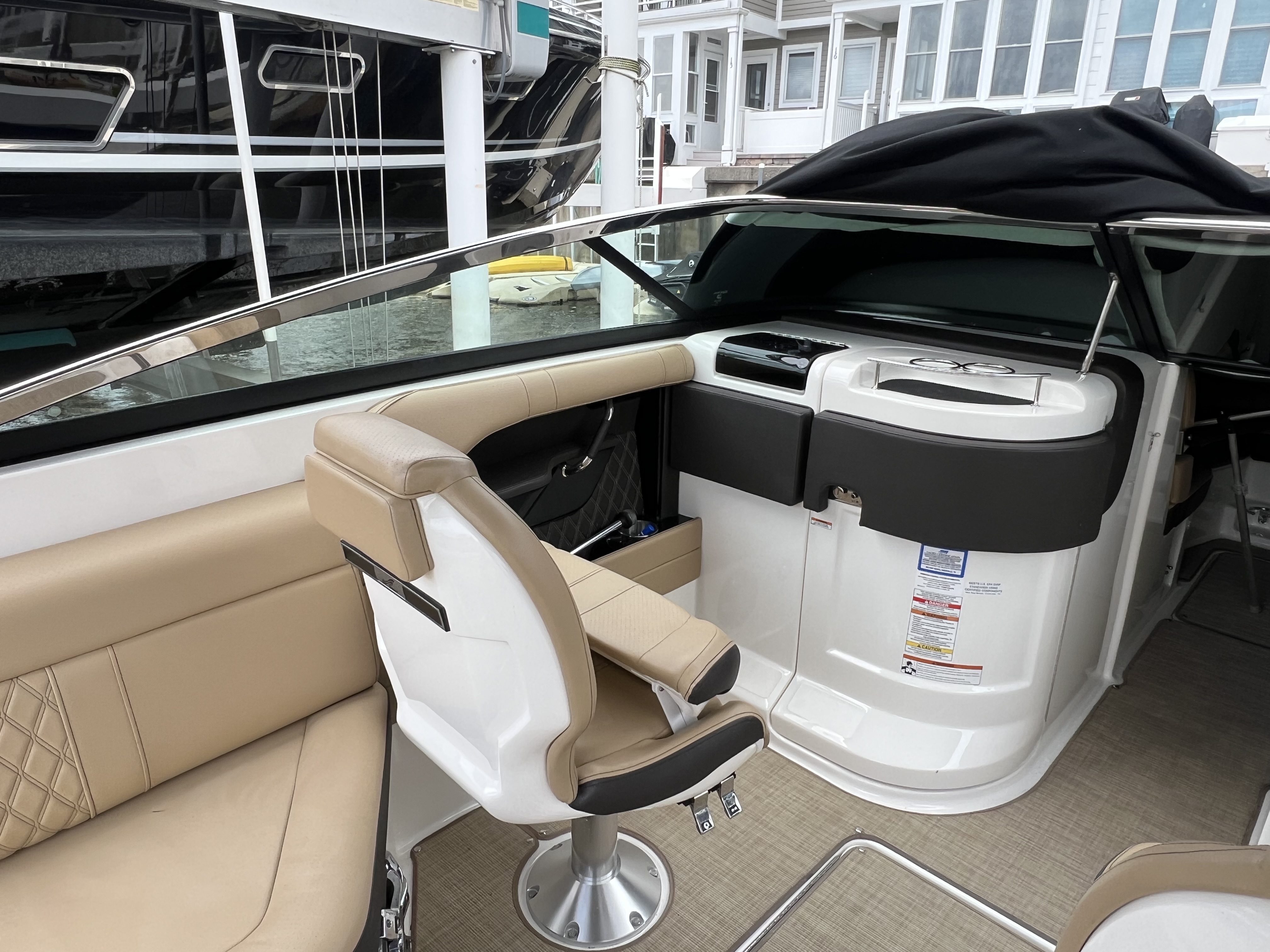 STK #SE-TB-19 Features an 8.2L MAG Bravo 3X DTS 380 HP sterndrive, black hull sides and bottom with Horizon gel stripe, black canvas, brown Infinity woven vinyl cockpit flooring, dune cockpit upholstery, fiberglass hardtop with opening canvas, black sport tower with bimini, cockpit cover with tonneau, SeaDek on the swim platform, Dynamic Running Surface, docking lights, blue LED lighting package, dual 12" digital dash with Mercury VesselView Link, premier audio upgrade with black tower speakers, premium PTM ski mirror, teak cockpit table, bow filler cushion, VacuFlush head with holding tank, onboard battery charger, stainless steel anchor with rope/chain windlass, air compressor for water toys, automatic fire suppression system, flag pole with U.S. flag.
