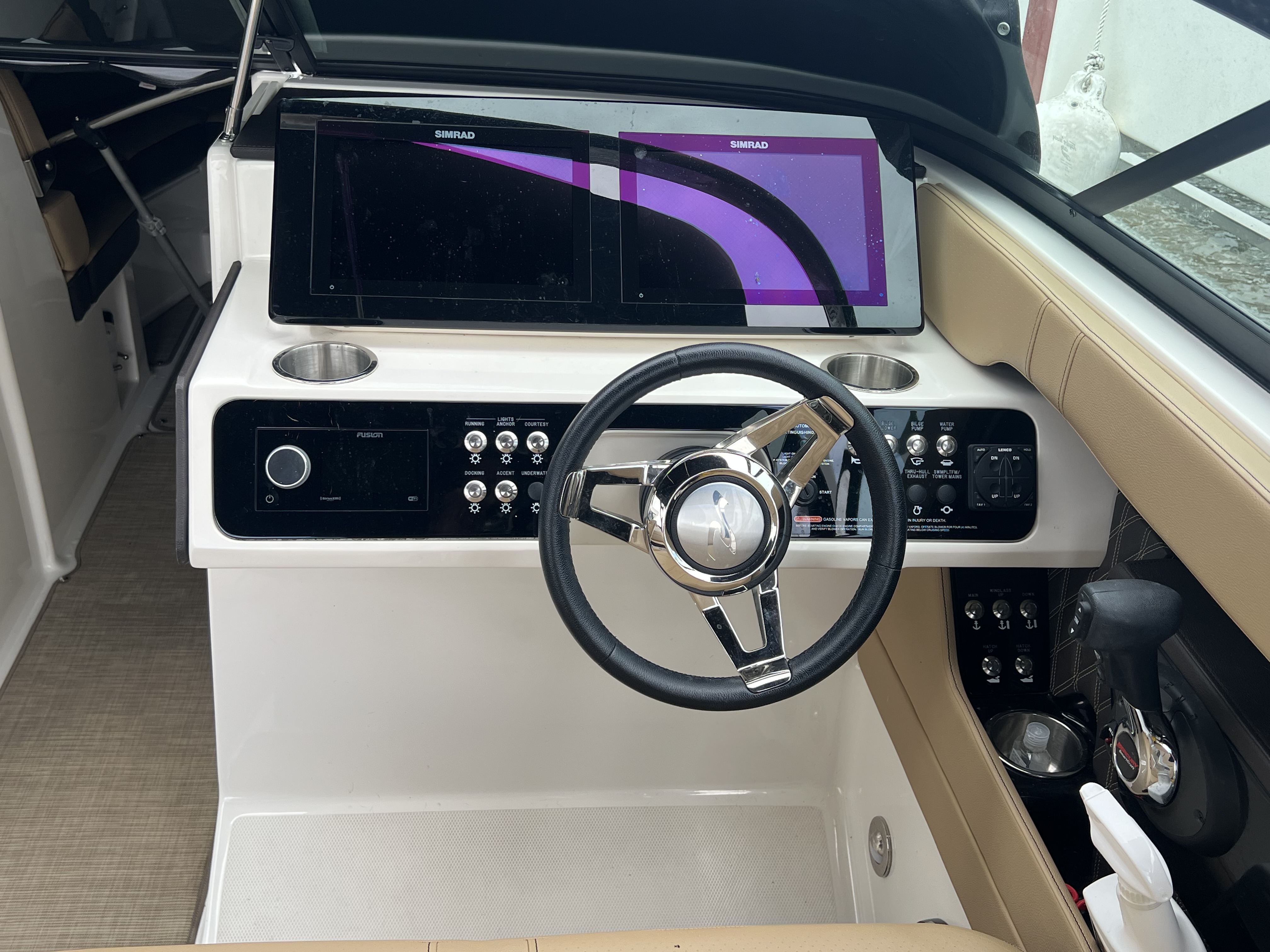 The intuitive helm comes standard w/ Dual 9" Simrad touchscreen displays w/ Mercury® VesselView® Link Data, chartplotting maps, depth & fishfinder capabilities