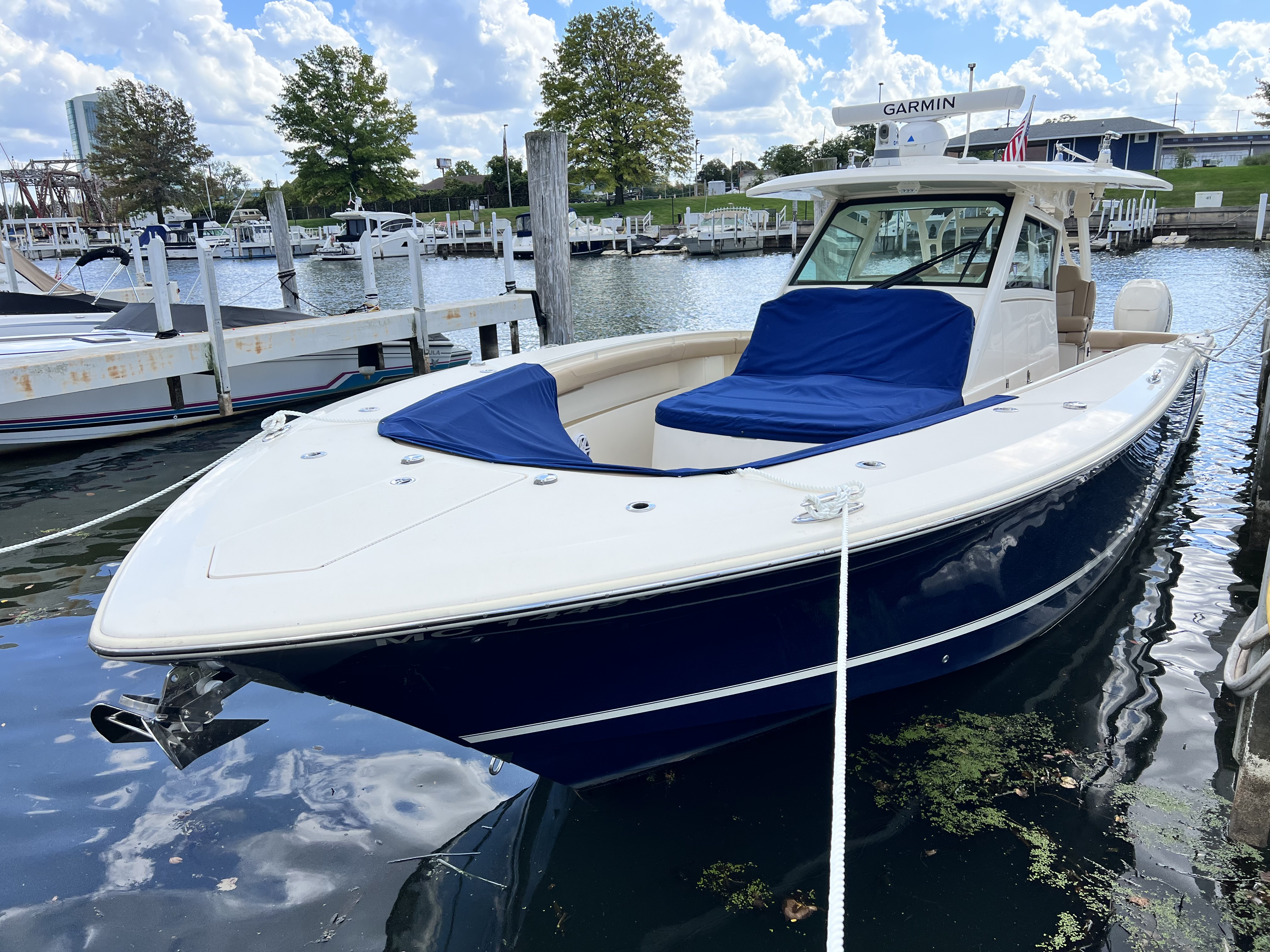 This 380 LXF is equipped with triple Mercury 400 Verados featuring joystick piloting for effortless maneuvering.