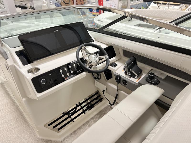 The intuitive helm comes standard with dual 9" (optional 12") Simrad SelectResponse‚ Glass Dash displays with Mercury VesselView Link Data, chartplotting maps, depth and fishfinder capabilities.