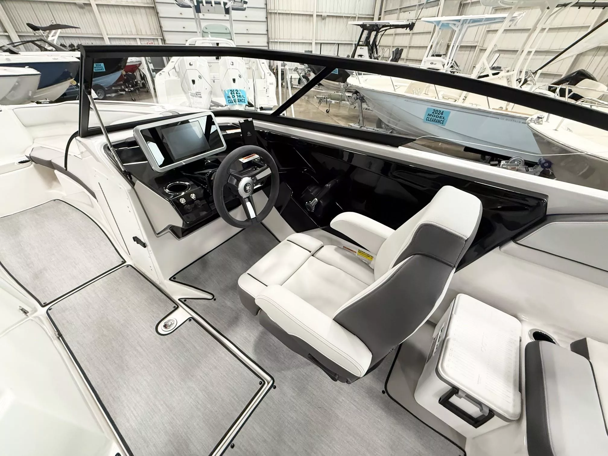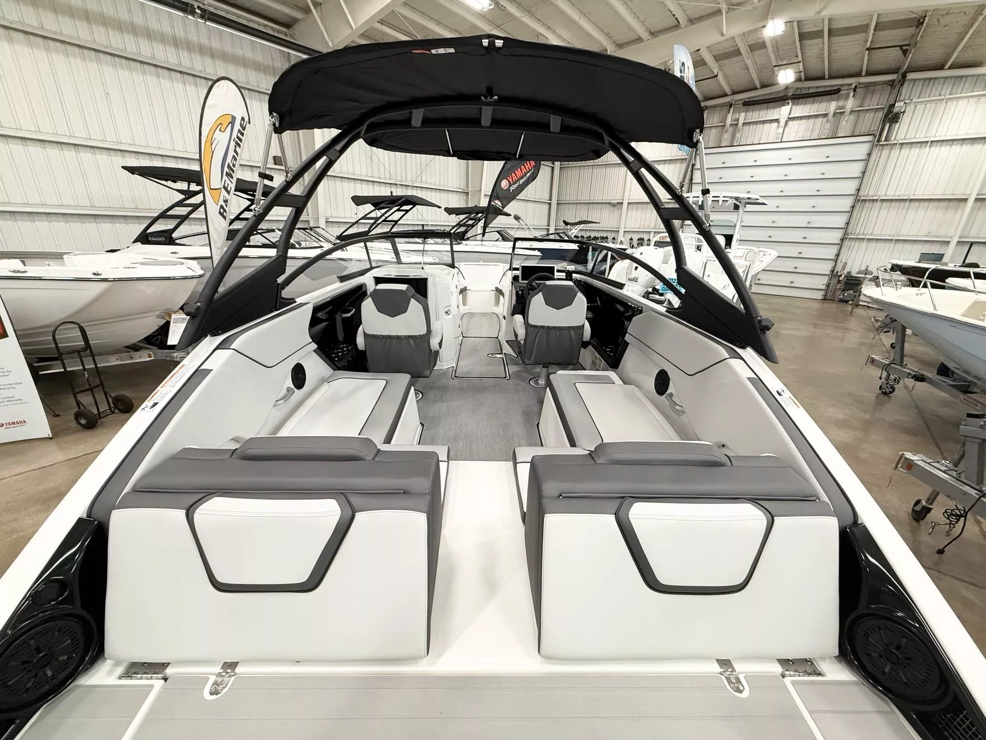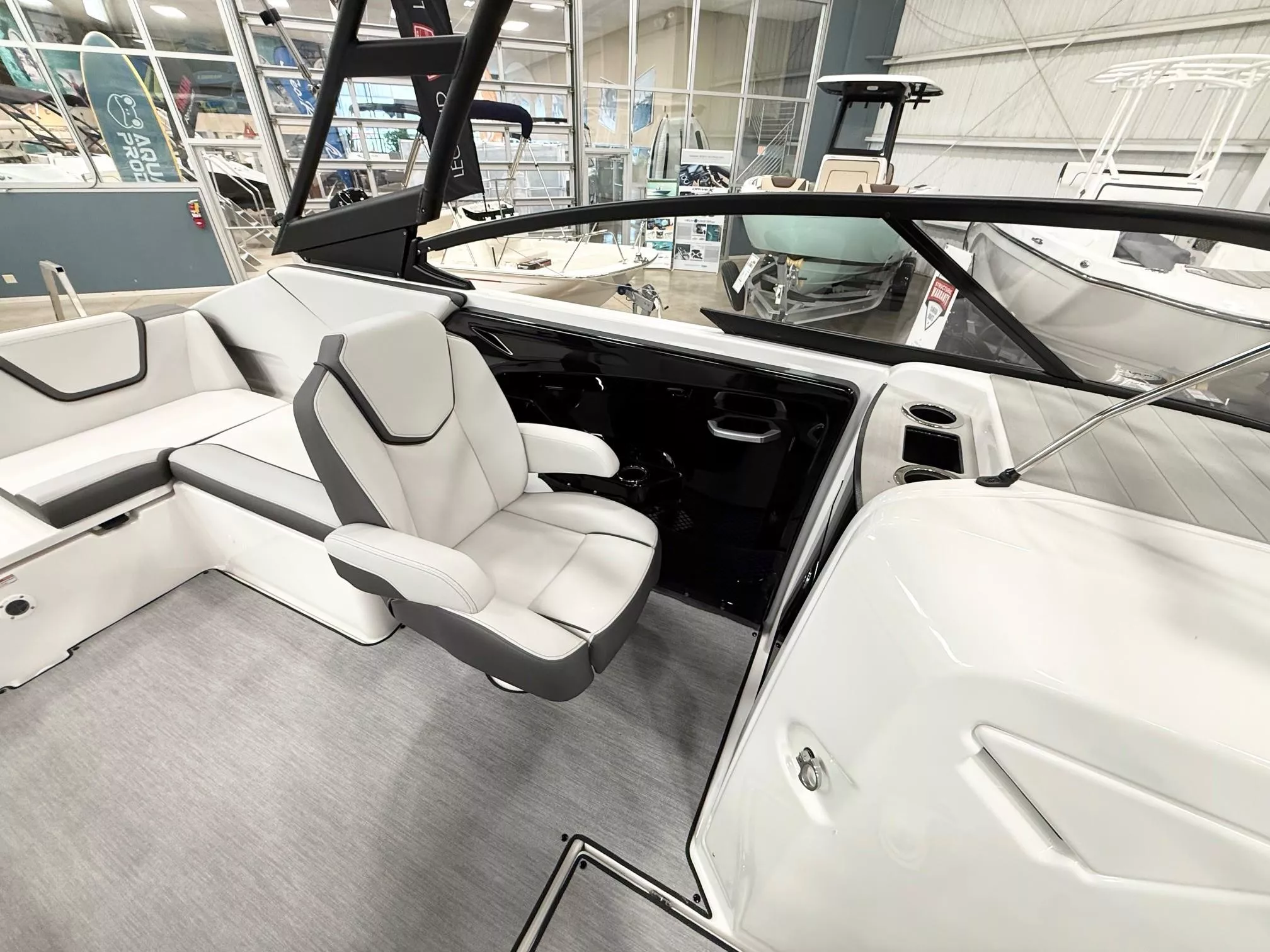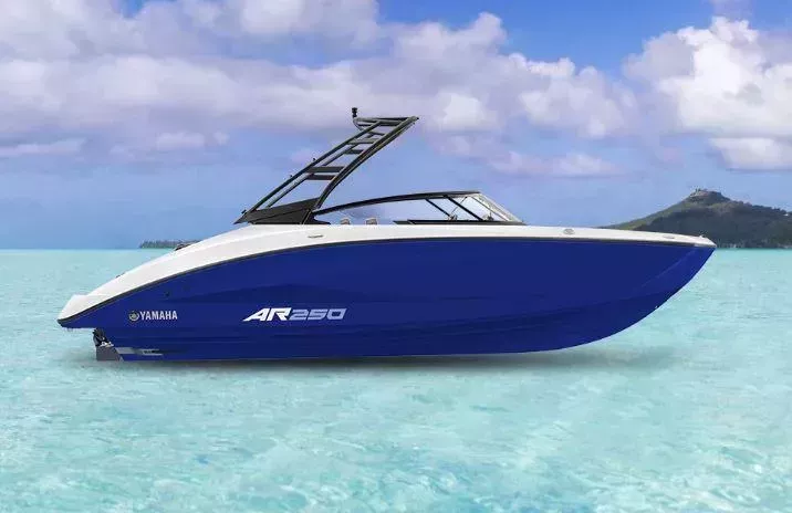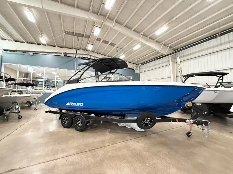 The AR250 is powered by twin 1.9L High Output Yamaha engines, offering smooth acceleration and powerful performance in a 25-foot package. With seating for up to 12, a roomy bow with backrest cushions, and a spacious cockpit, it's perfect for comfort and group outings. The oversized in-floor storage locker easily manages wakeboards and gear, while the 5" Connext touchscreen at the helm provides seamless control of boat systems and entertainment. A custom-painted trailer ensures this jet boat looks stunning on both water and land.