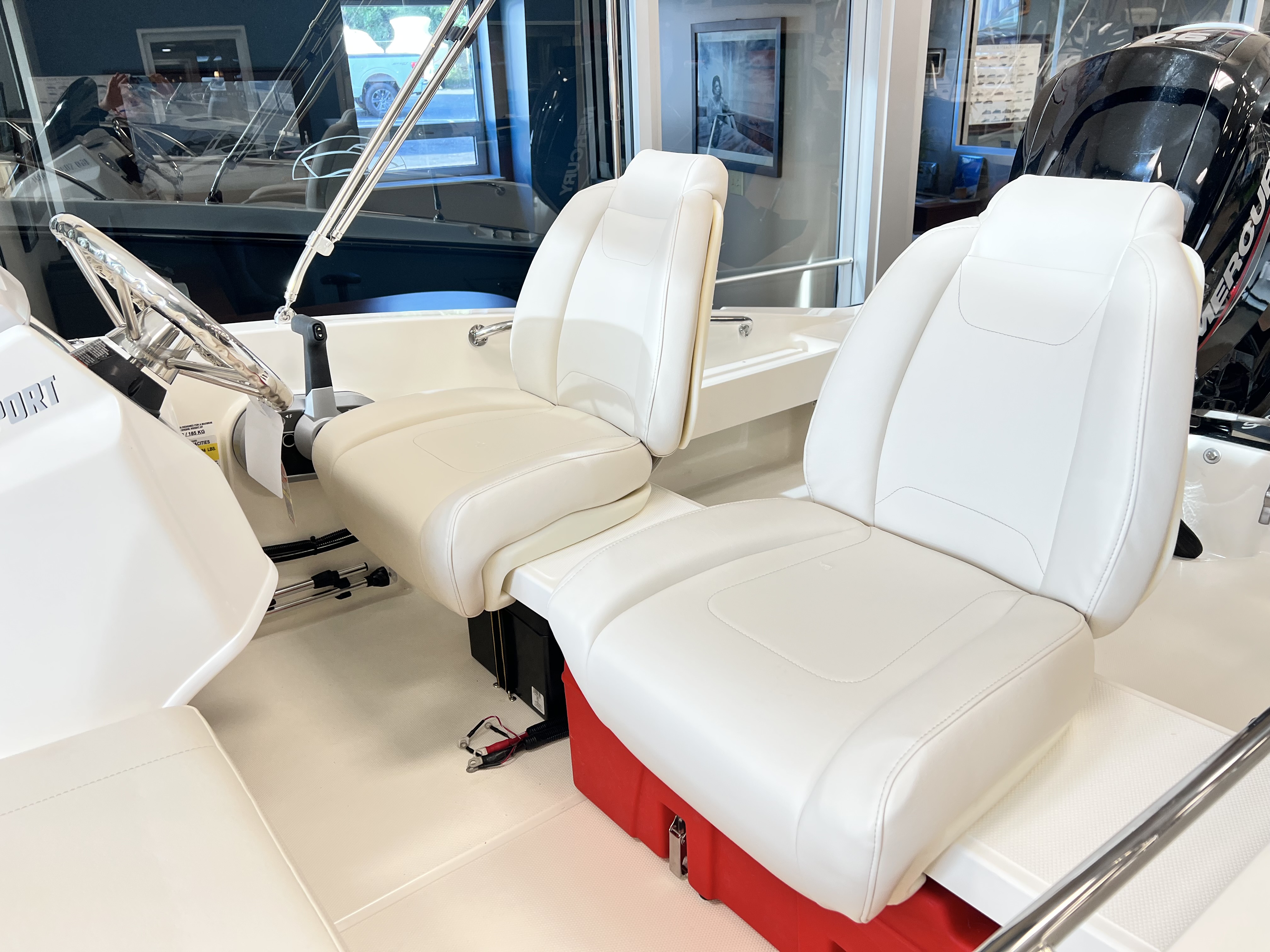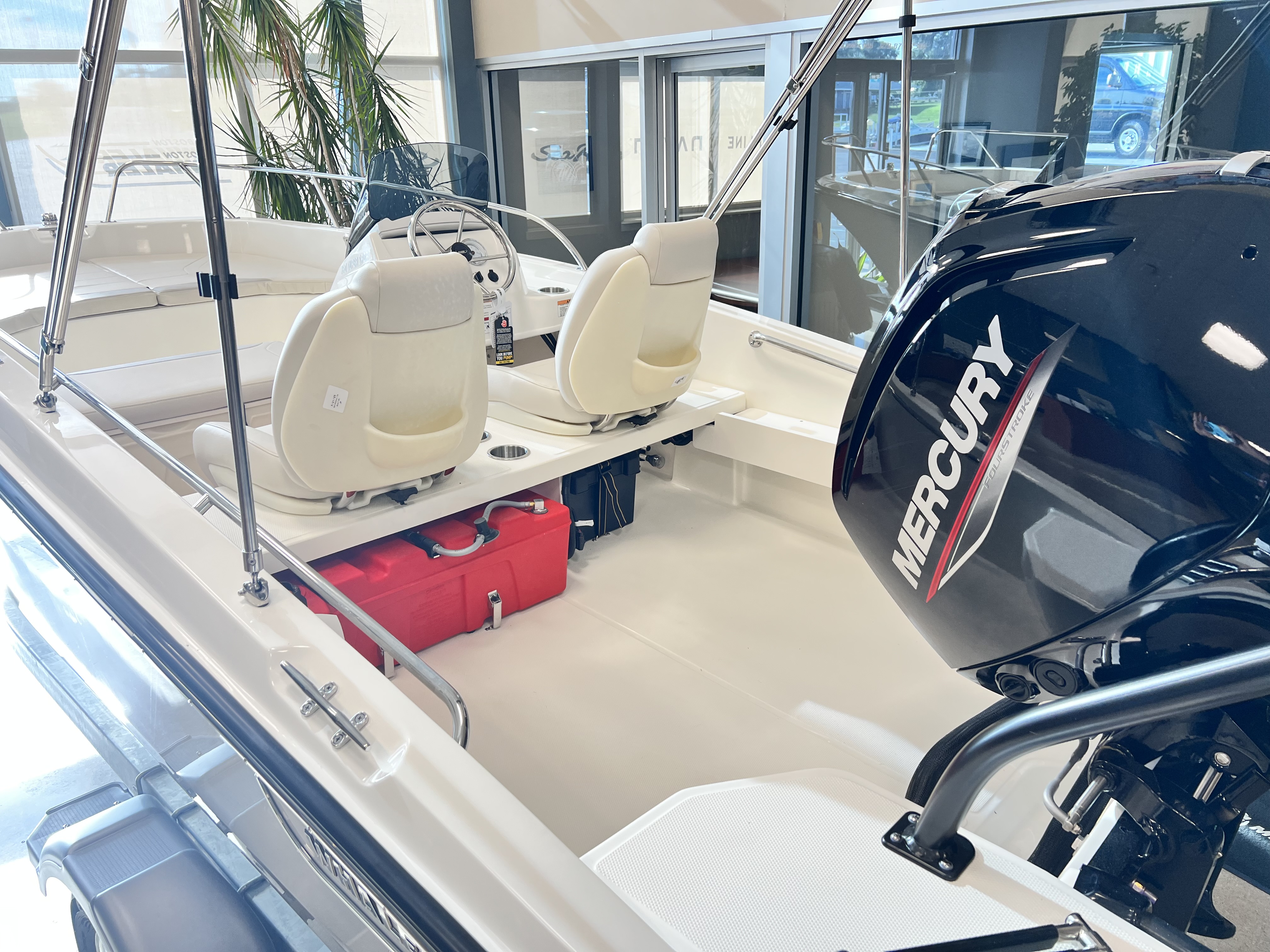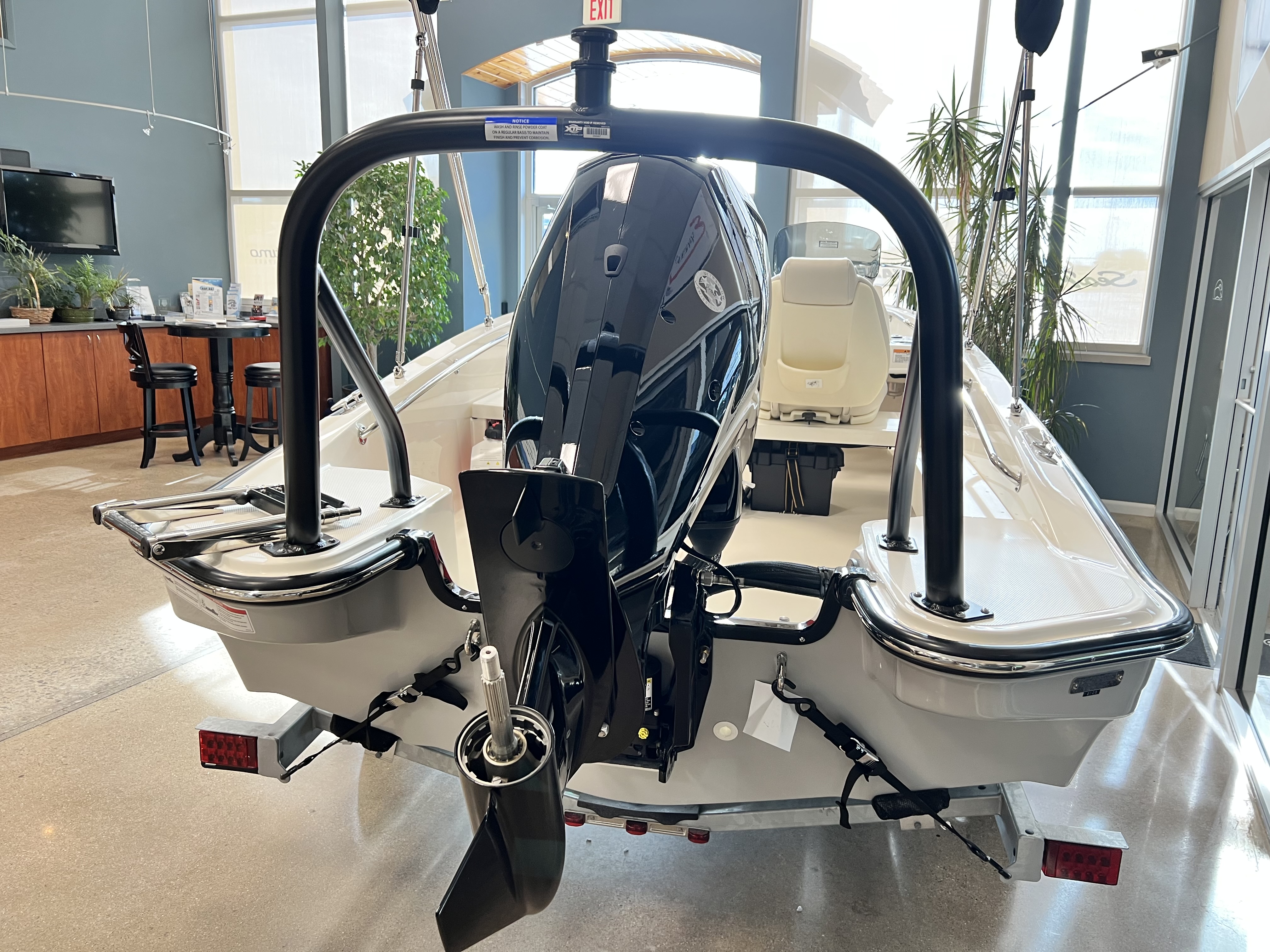 Platinum Gelcoat Hull, Chrome graphics, Black canvas - optional, black frame, 90 ELPT EFI 4-Stroke Mercury Engine, Split Bow Rail, Black Rubrail with Stainless Steel Insert, Winshield, Sun top with boot, Top side fuel tank 19 gal, Ski tow, Galvanized trlr w/ radial tires, Bow cushion, Bucket sport seat (pair), Cnsl side st cooler cushion