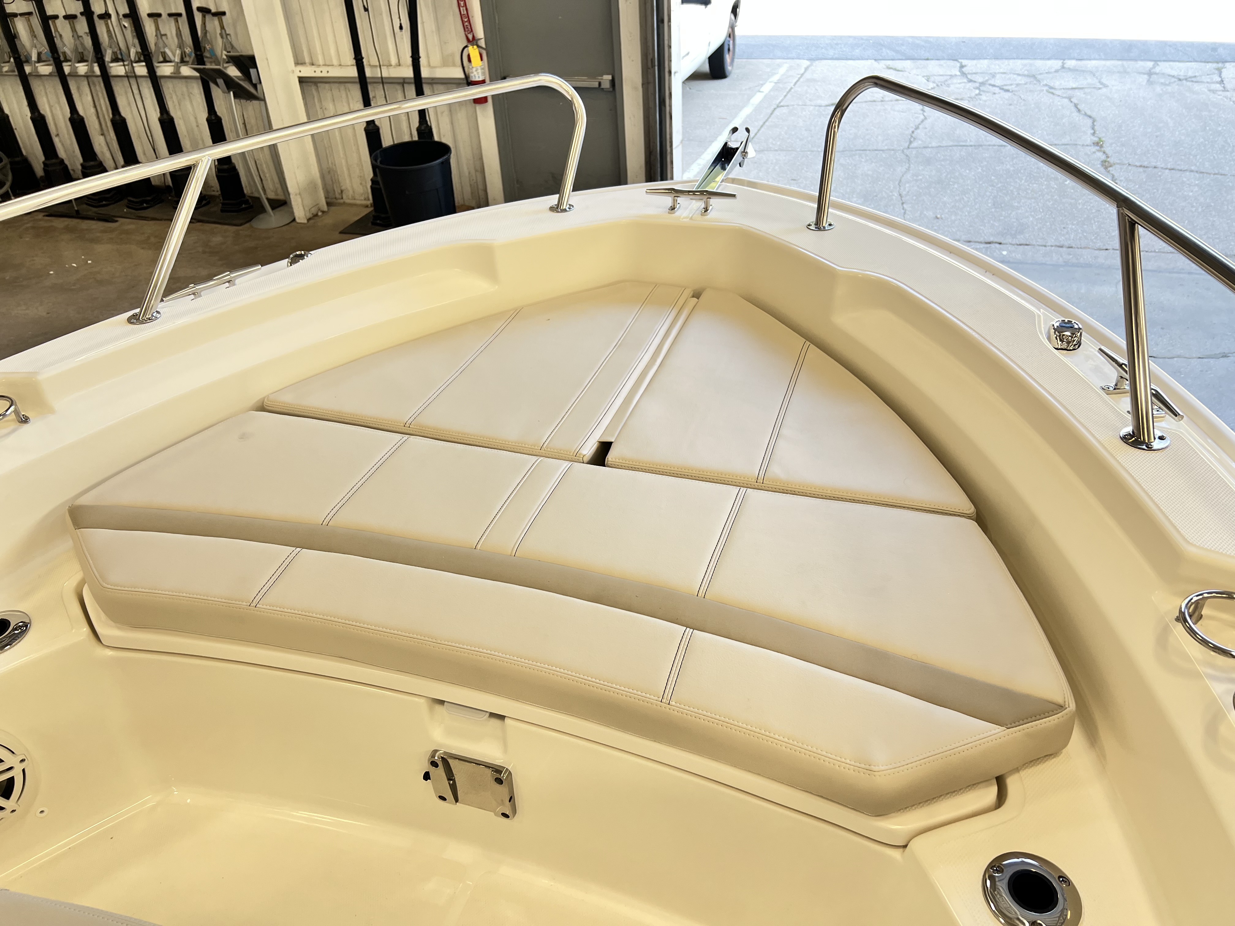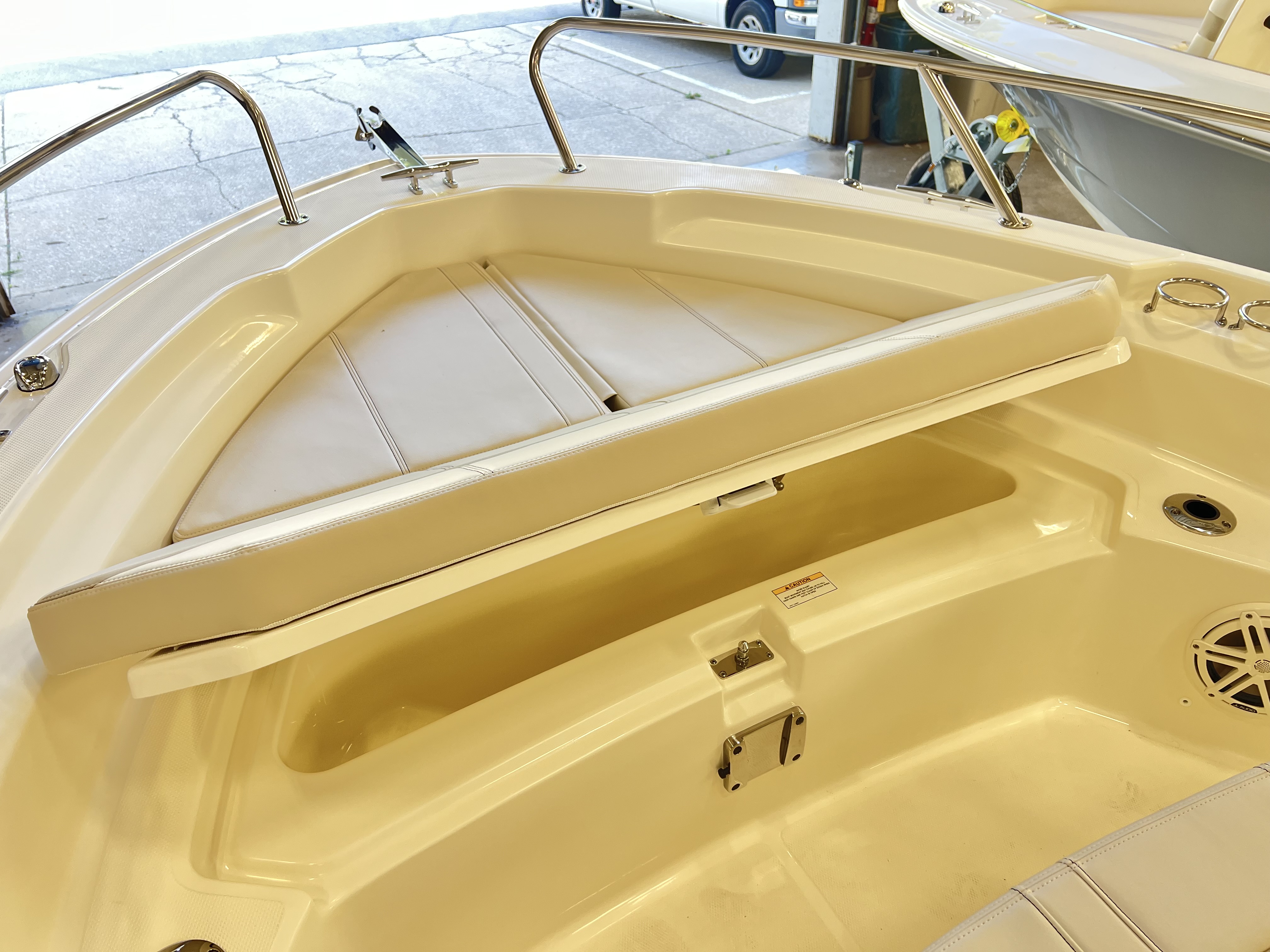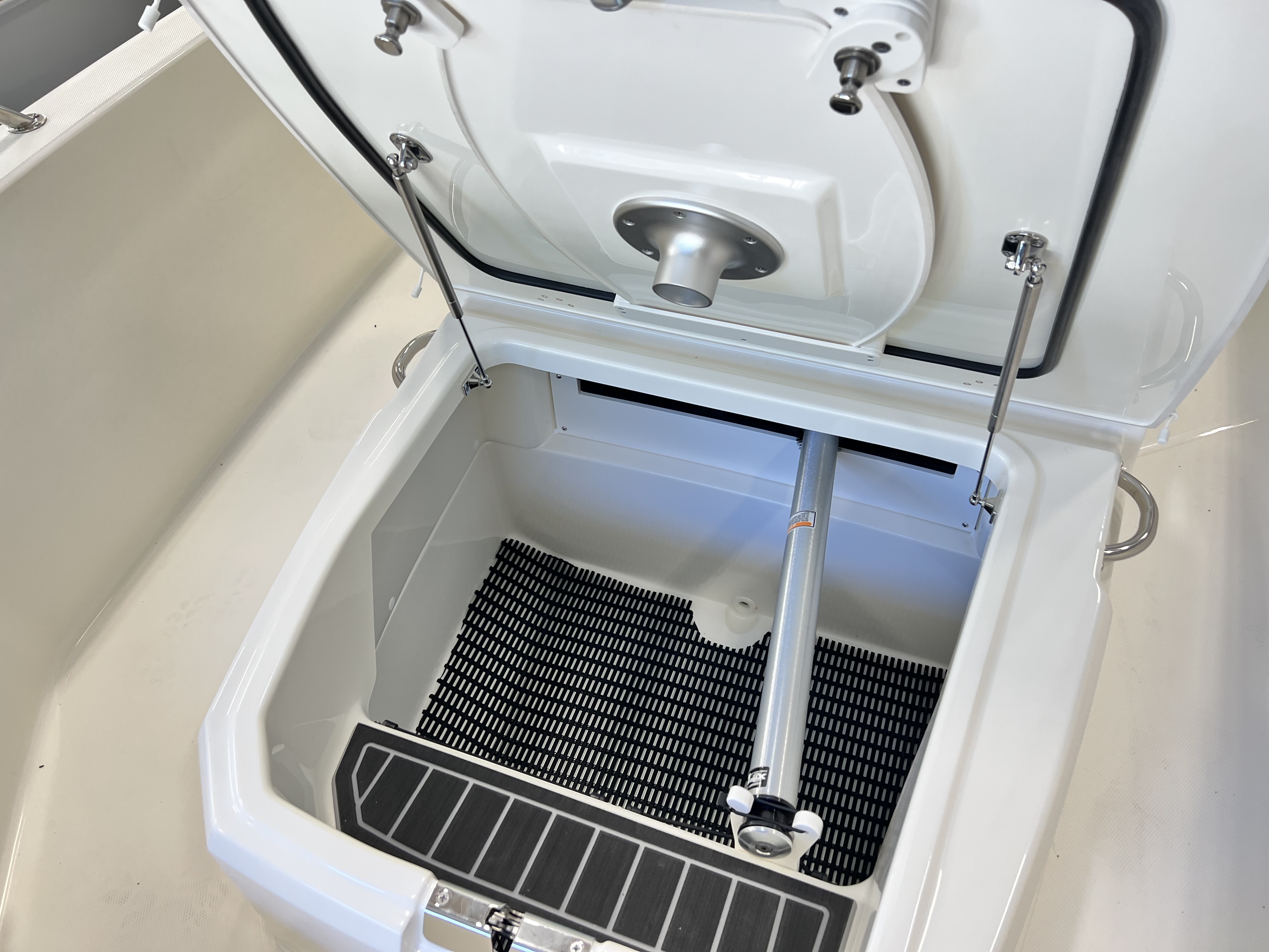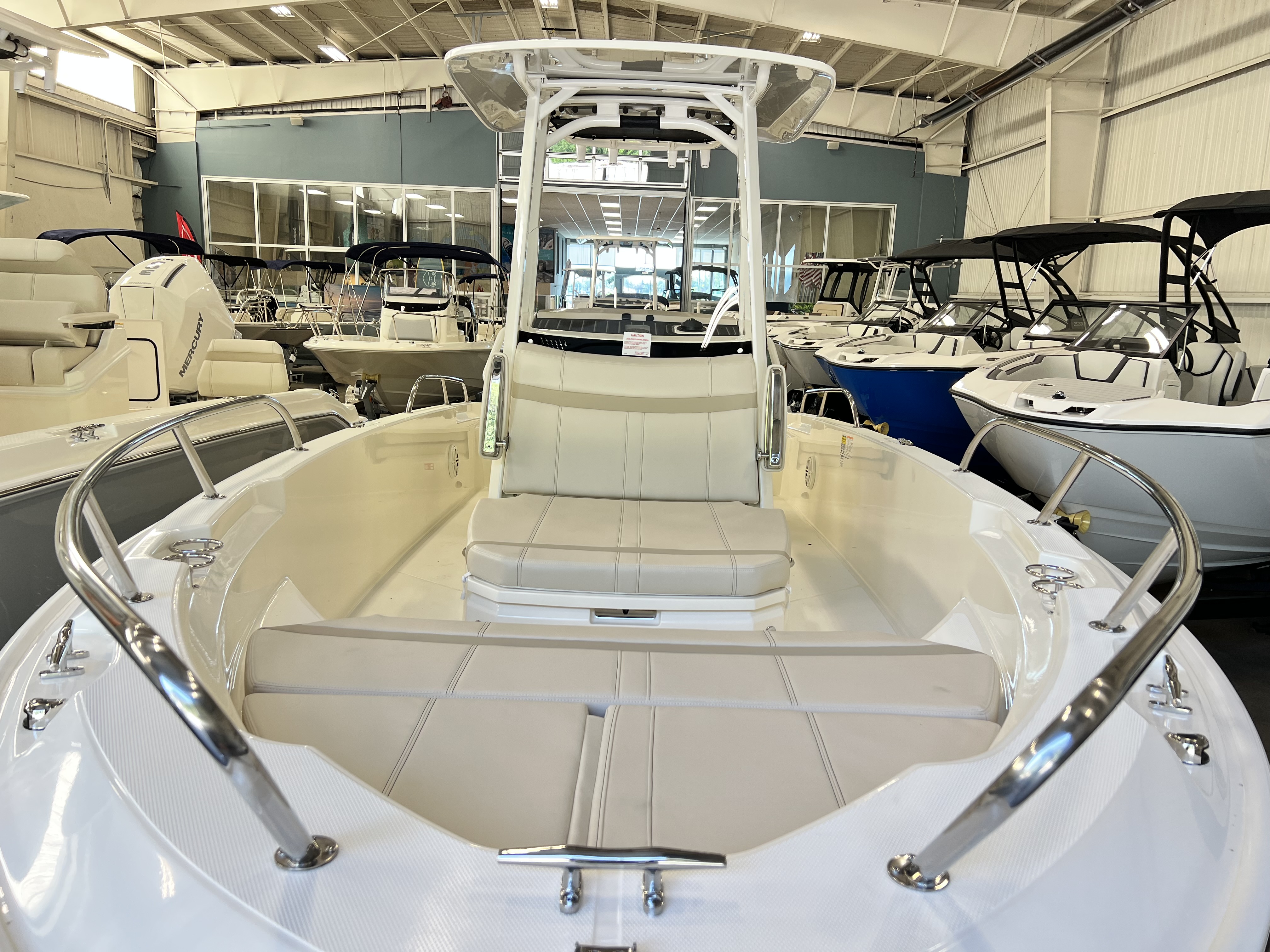Platinum gelcoat hull, platinum gelcoat underside of H/T, Chrome Graphics, Black Canvas - optional, White frame, 250 XL V8 CMS (DTS) MERC WHITE, Anchor roller, Split Bow Rail, White rubrail with stainless steel insert, bow cushion, bow table, reversible pilot seat w/ livewell, fiberglass hardtop, ski pylon (includes base), glovebox, stereo, vessel view display
